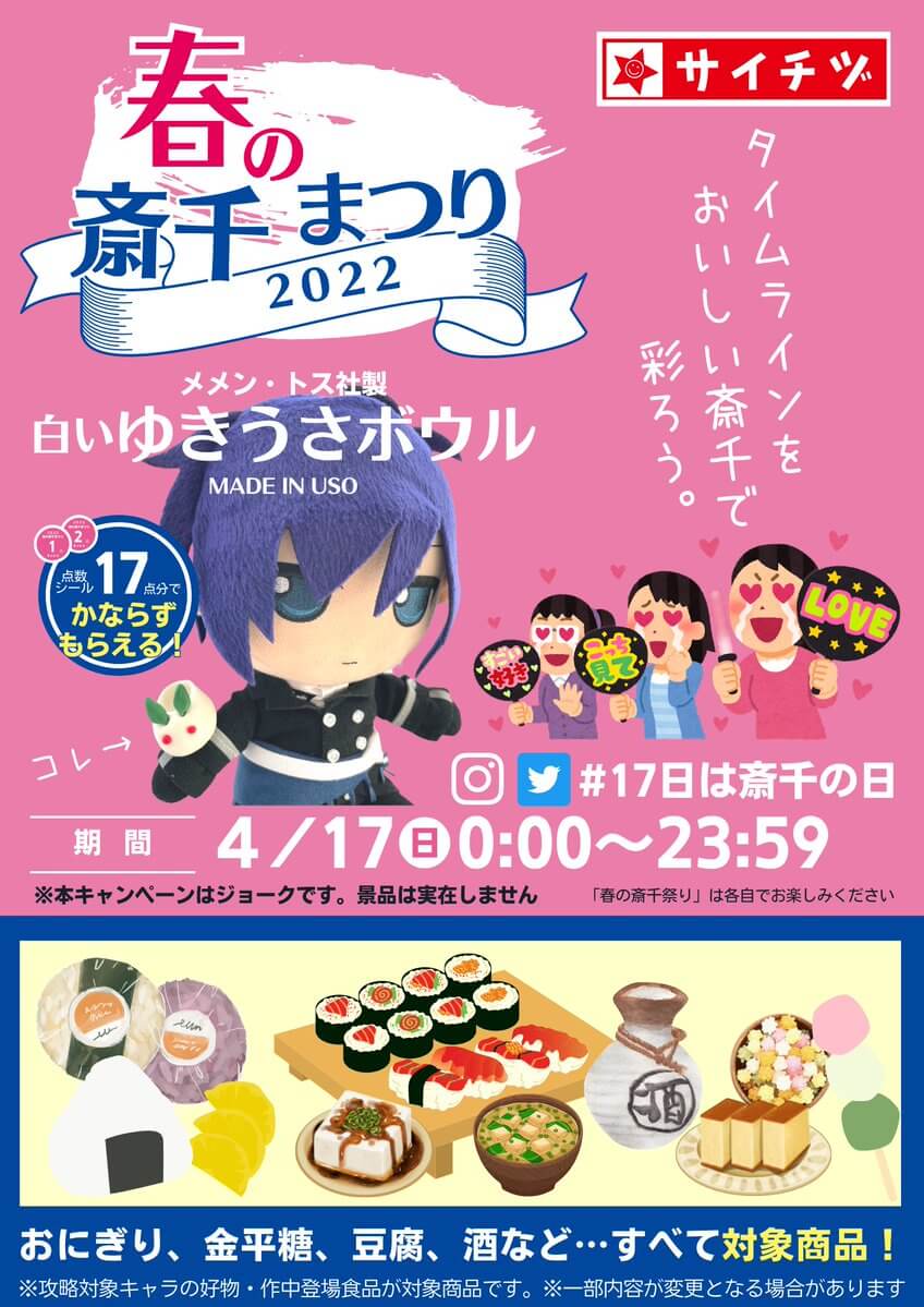 TOP > 作品紹介 > 春の斎千まつり(広告風ネタ画像) 4月 16, 2022 明日!17日!!春のさいちづまつり!#17日は斎千の日 pic.twitter.com/fr0Q1b9hyv— めめんとす🍙さいちづ尊いbot (@oto_mementos) April 16, 2022 発行日:2022年4月16日 X(当時Twitter)で発表 制作エピソード これもまじで、なぜ作ろうと思ったのか本当に思い出せない…… しかし、これも春になるたびに貼り付けてはたくさん反応いただいている、とても使いやすい素材だったなと自負しています。 そのうち本当にシール作ってくばろうかな……🤔(ぜったいうそ) ちなみに、この日、わたしお誕生日です。何やってんですかねこの人。 ㊗️おめでとうわたし!!🥳8ちゃいになりました!!🙌🙌🙌引き続きよろしくお願いしま!🥰👍 pic.twitter.com/Sj8UZJKyBE— めめんとす🍙さいちづ尊いbot (@oto_mementos) April 15, 2022